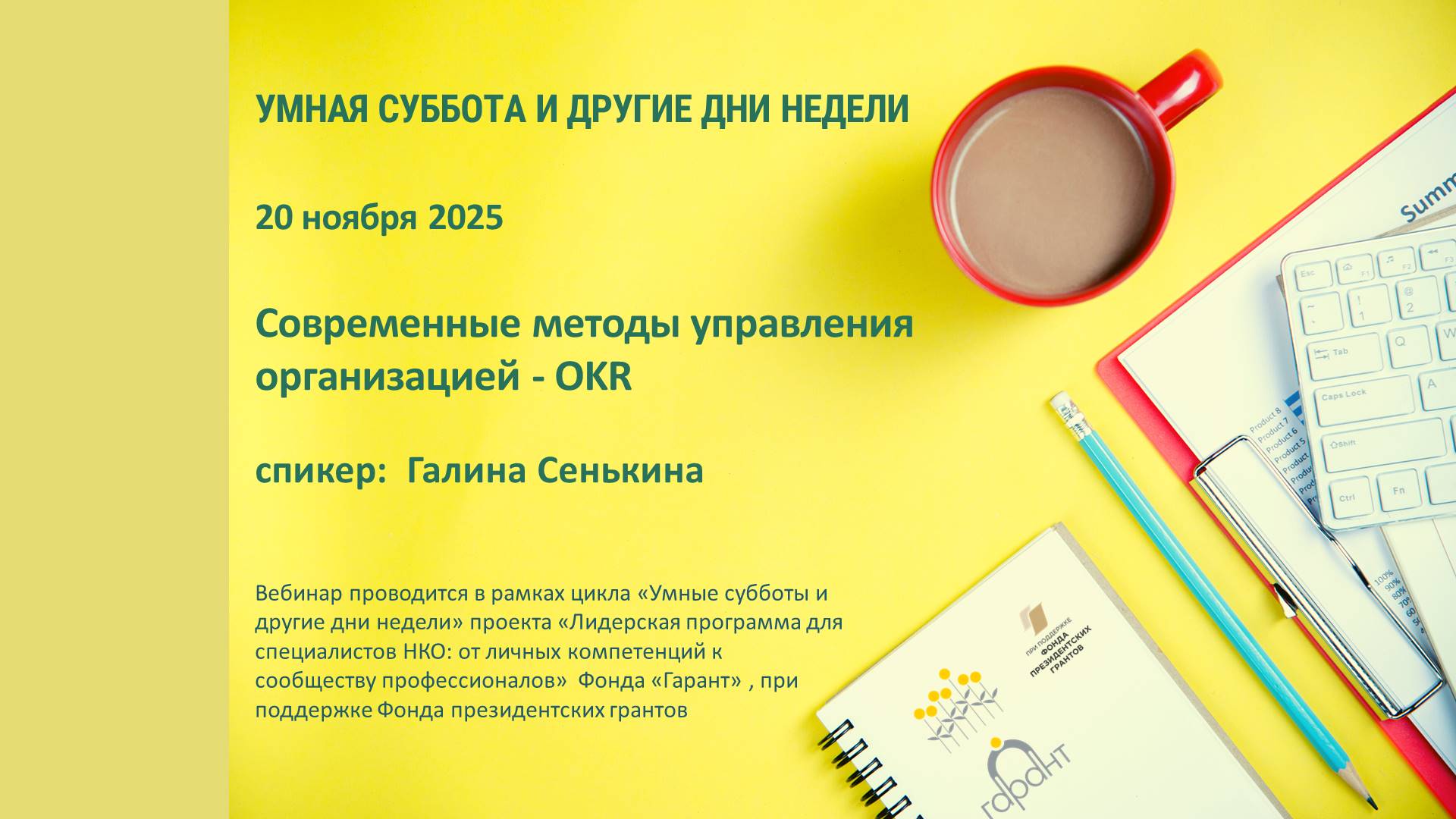 Вебинар проводится в рамках цикла «Умные субботы и другие дни недели» проекта «Лидерская программа для специалистов НКО: от личных компетенций к сообществу профессионалов» Фонда «Гарант», при поддержке Фонда президентских грантов.